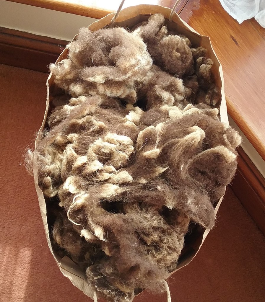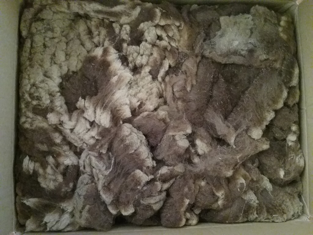 This portion of the post has been updated as I spent part of Tour de Fleece 2025 using my drum carder to card the rest of this fleece. I was much happier with the fleece in batts – the short staples were holding together much more easily and the coarser fibres weren’t quite as ingrained into the fibre, so would be more likely to fall out during spinning. Something that became apparent when drum carding was the sheer amount of fine dust that was in this fleece, so much so that the rest of the carding was done outside.