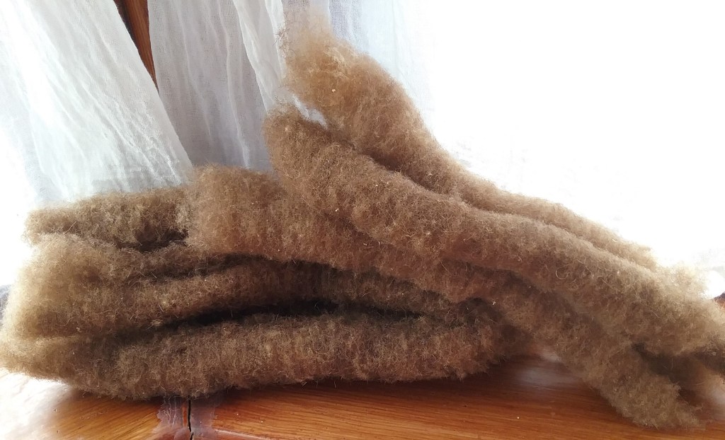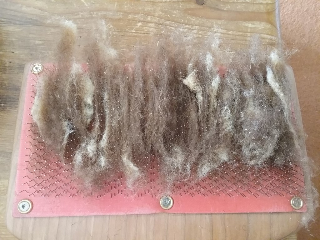 When I began to card the Castlemilk Moorit and started to apply the fleece to the carders it became more obvious that there was actually a coarser second coat I hadn’t noticed before. As Castlemilk Moorit has a very short staple (I measured 5cm) these fibres blend in very well and are hard to separate since they are of similar length. Although hand carding was easy I wasn’t happy with the rolags produced, so put the fleece to the side for a couple of years.