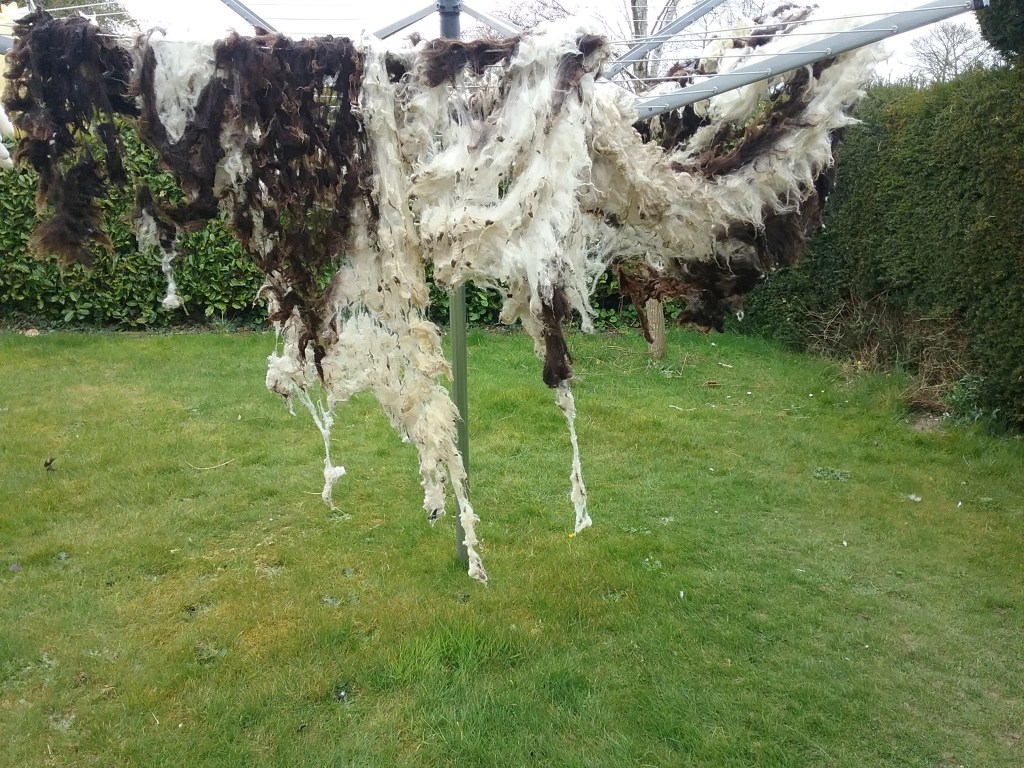 After rinsing, I put the fleece out on the washing line to dry. The smell of the suint bath is supposed to vanish when the fleece is completely dry as the bacteria in the process are anaerobic, so only function in water.