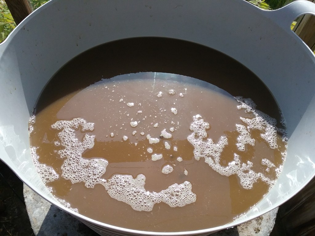 I then put the second half of the fleece in the suint water and topped it up slightly with more rainwater (most people recommend using a lidded container to reduce evaporation, as topping it up dilutes the suint bath, but I’m working with what I already have). The weather then got warmer so I saw bubbles on the second half in about 4-5 days and the smell was much more potent when I removed it for its rinse.