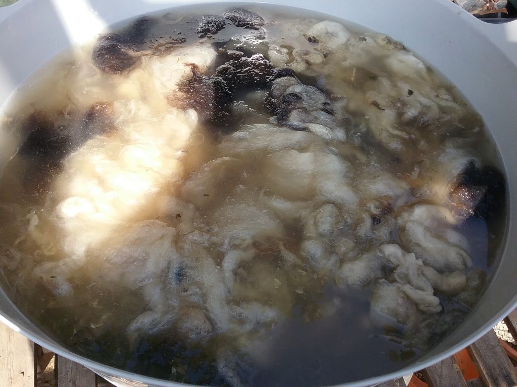 The water very quickly went grey/brown in colour and I checked it each day for any sign of bubbles on the surface and a potent farmyard smell that should mean it’s working, but didn’t notice either until after about 8 days. At this point I removed the fleece, draining the suint water back into the bucket before transferring the fleece to another bucket of fresh rainwater to rinse overnight.