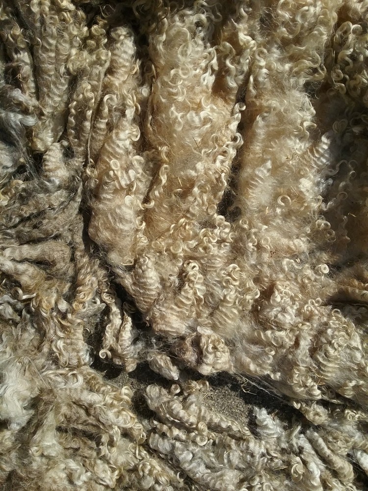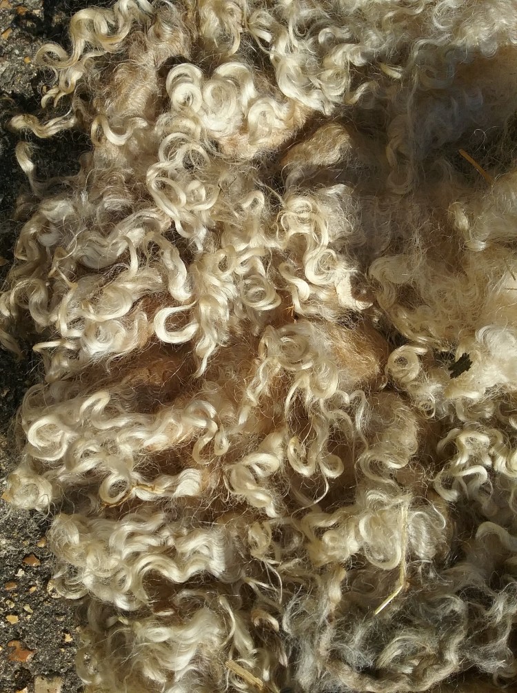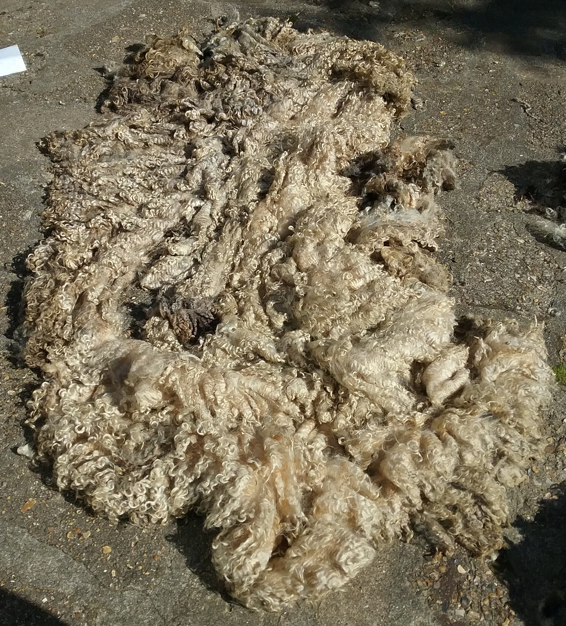 I was surprised by the weight of this fleece when it arrived (some Longwool fleeces can weigh up to 8kg) and by how much there was of it (it isn’t fully spread out in the photo). The fleece was, as my research suggested very greasy, but overall it was reasonably clean without much VM. As expected, there were some dirty sections around the rear, but these were very easy to separate and compost as the fleece is arranged in individual locks. The colours in the fleece were beautiful – areas of grey blended with the white. I had wondered if the grey areas were kemp hairs, however they are the same length as the rest of the fleece and don’t feel any coarser, so as far as I can tell, it is just the natural colouring of the sheep.