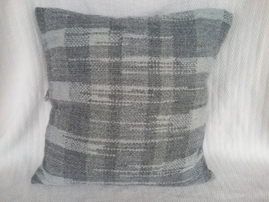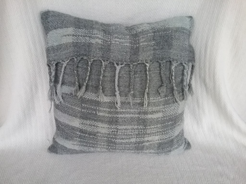 Back in October 2020 I shared photos of a sample of weaving I had made with the intent of turning it into a cushion cover, but I never took the time to sew it up. I have challenged myself this year to finish off any UFO’s (unfinished objects), so I wrangled it under the sewing machine and fashioned it into a cushion cover. It is constructed by folding the fabric twice right sides together and sewing along the selvedge’s leaving enough space at the opening fold to insert the cushion. I used a straight stitch with a short stitch length as I sew on a vintage hand crank machine (I don’t like electric machines) and the seams are very secure. I had intended to cut off and hem the braided ends, as it was just the way I had kept the warp ends from tangling during washing, but I decided they looked quite nice, so left them be.