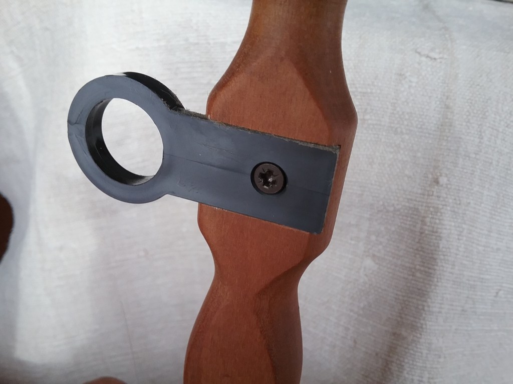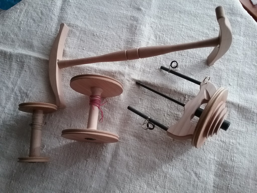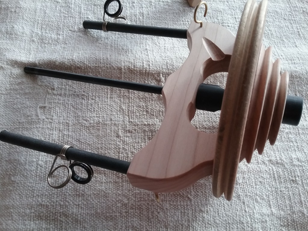 My flyer was purchased unfinished, so the first job was adding a couple of coats of wax to the wooden parts of the flyer and bobbin. I also took this opportunity to wax my niddy noddy and one of my standard bobbins that were still unfinished. You could use an oil or lacquer finish instead, but I had wax to hand, it doesn’t have a strong smell and is easy to apply. After polishing the wood you can then slide the hooks onto the rods and screw the guide hooks into the pre-positioned holes.