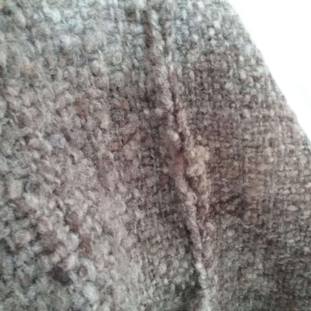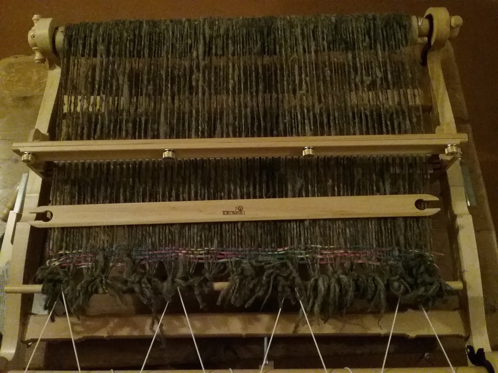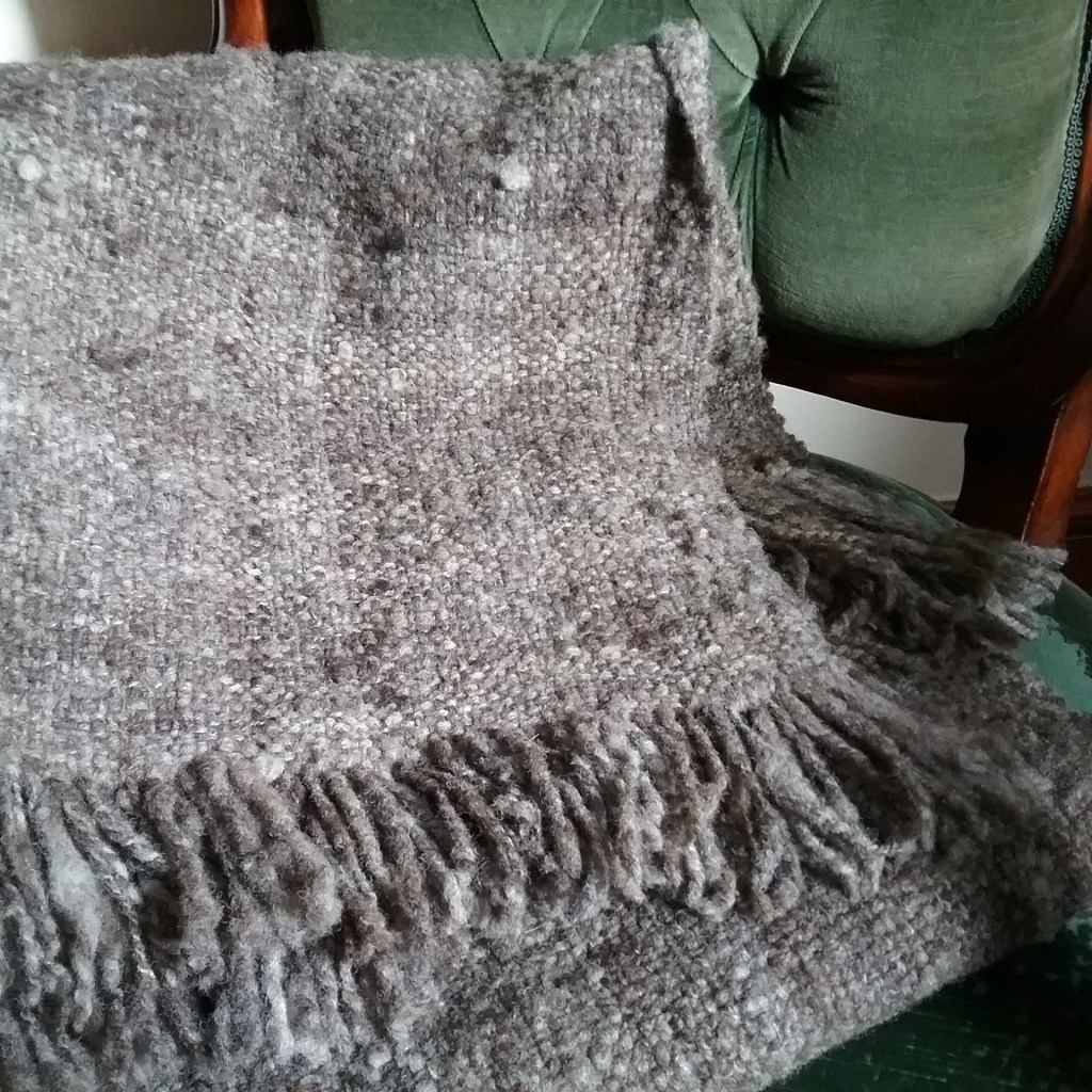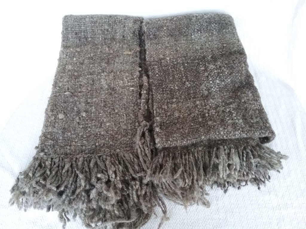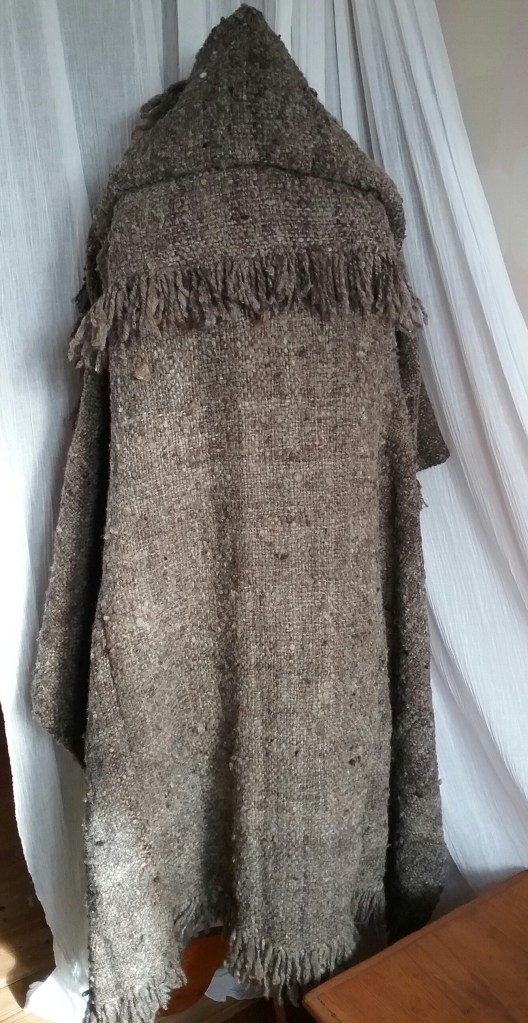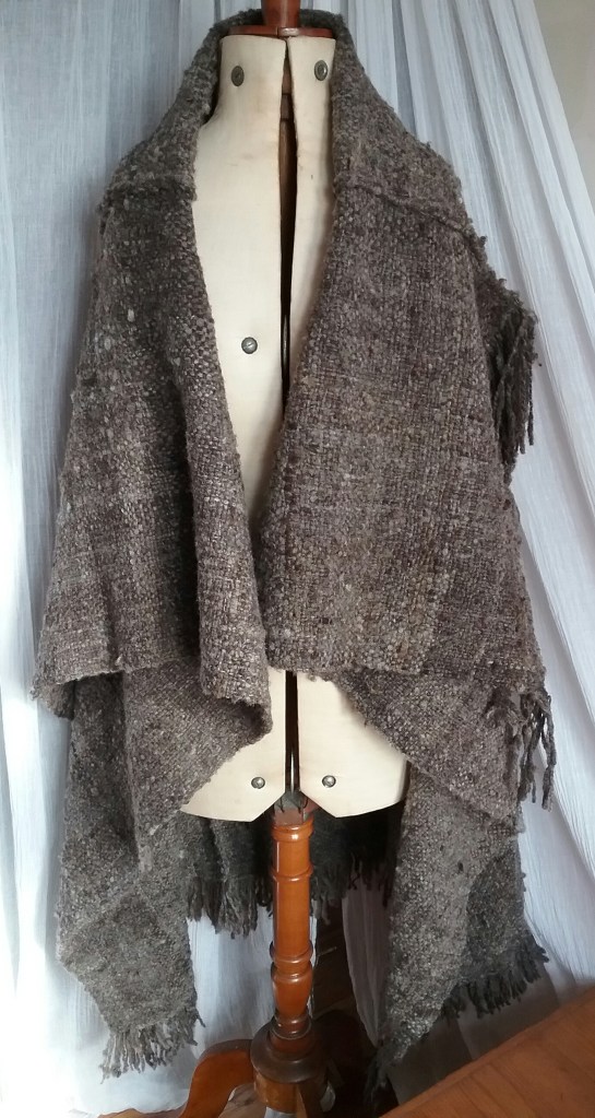 I am very happy with how this eventually turned out, it works both as a very cosy poncho/jacket, but also can be used as a blanket, so is the best of both. I’m also glad I took the time to think about it as it’s forced me to try indirect warping which has been on my to-do list for quite some time. In spite of my worries about having enough wool, I still have a couple of balls left at the end of it, which shows just how much fabric can be made from one small fleece.