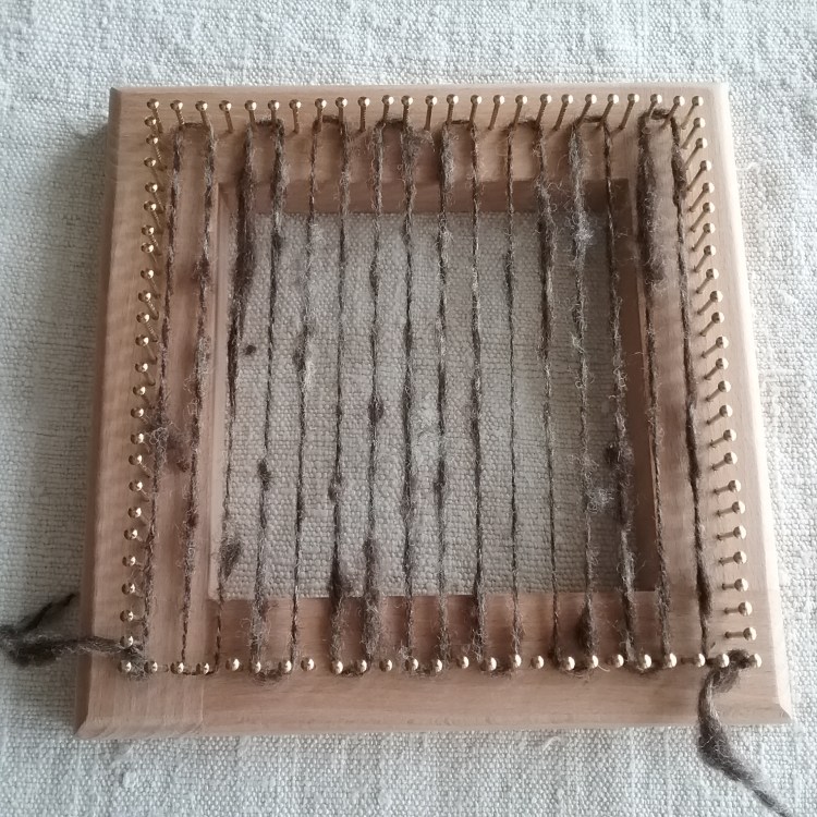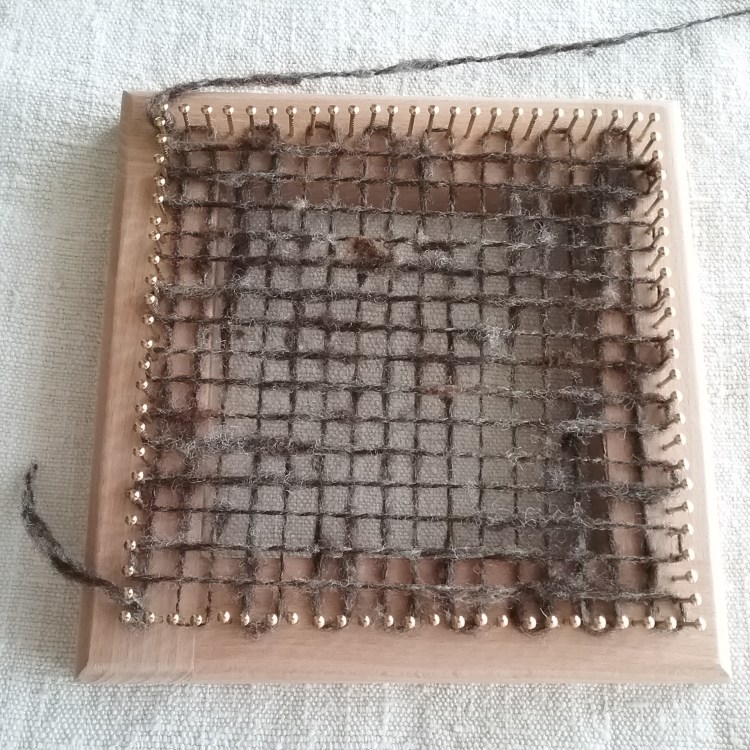 My main Ryeland project was the woven poncho, so my breed study square needed to be plain weave. The easiest way to weave small squares is on a pin loom. These can be DIYed (there are lots of tutorials online), but I recently attended a local yarn fair where a lovely vendor was selling beautiful handmade pin looms so I decided to buy one. There are two directions of weave you can make on a pin loom; bias and straight (links will take you to some good Youtube tutorials). In order to match the weave of my poncho I opted for a straight weave – the process of which I show below.