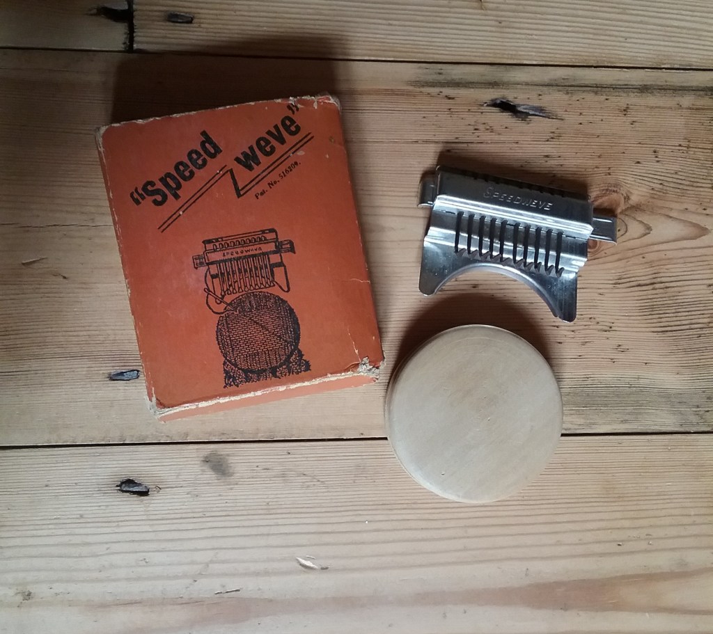 I’m a big advocate for repairing garments rather than replacing them and shun the throwaway culture of fast fashion wherever I can. A darn is one of the most common repairs required and can be used on most fabrics. Darning is essentially weaving without a loom, threads are laid across the fabric forming a warp before a weft is passed through. Depending on the repair, darning can be quite a fiddly and tedious task, so I was excited to discover that in the 1940’s-1950’s A. Chesstock of Manchester manufactured a ‘loom’ to make the process easier. I bought the ‘speed-weve’ at a car boot sale, it was in good condition without any rust and still had the original instructions. I’m always excited to try a new fibre gadget and the instructions are set out in 4 easy steps, so I set out to see if this device helps or hinders my darning.