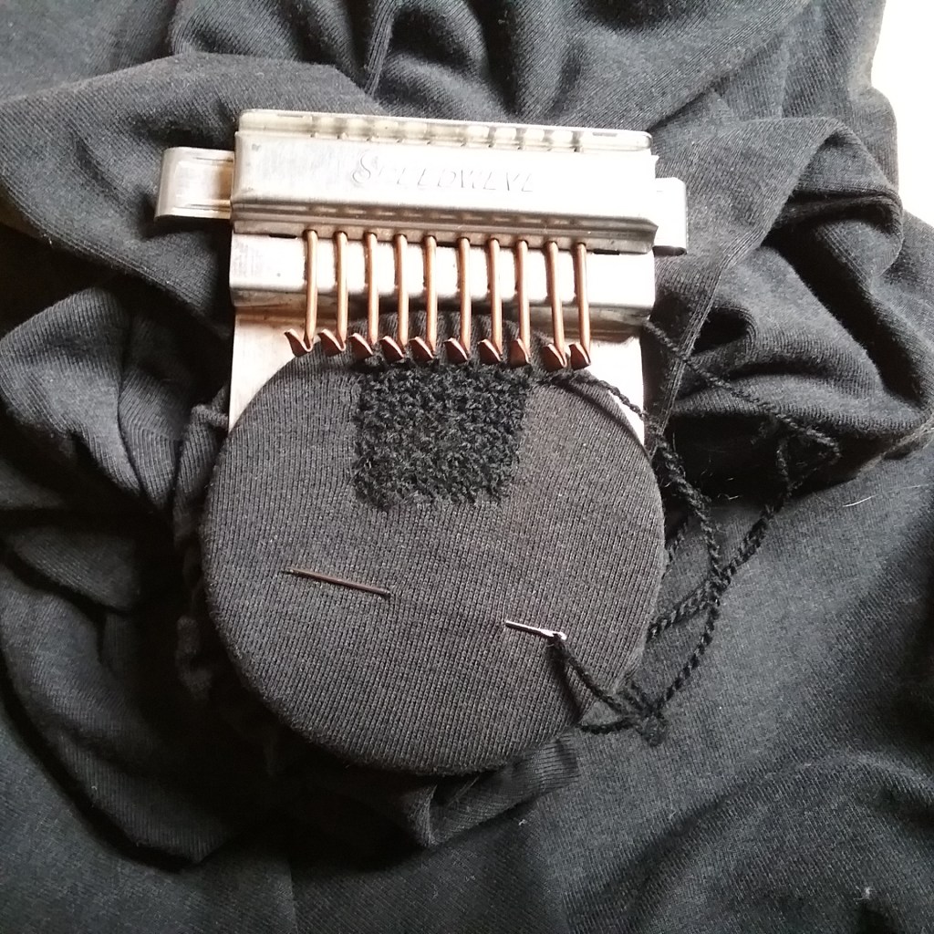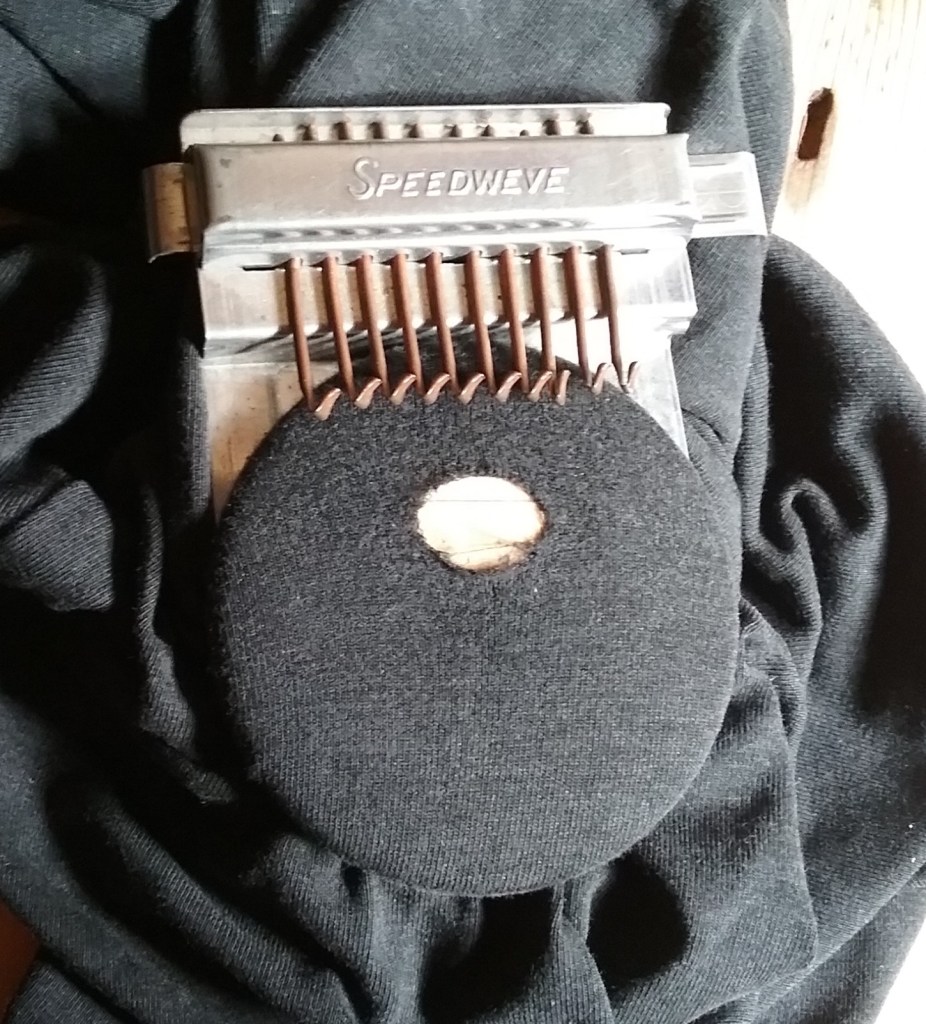The instructions tell you to darn on the right side of the fabric, to place the wooden disc under the hole (as you would a darning mushroom) and use an elastic band to hold the fabric in place in the groove. Then slot the metal part into the groove and secure with another elastic band. I was weary of using elastic bands in case they snagged the fabric, so opted to use a hairband instead and manoeuvred it over both parts of the loom at once.