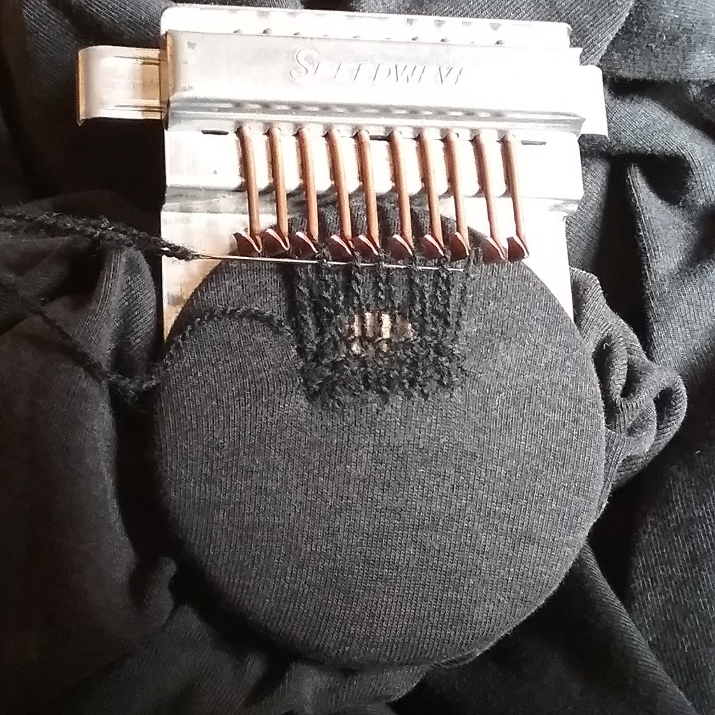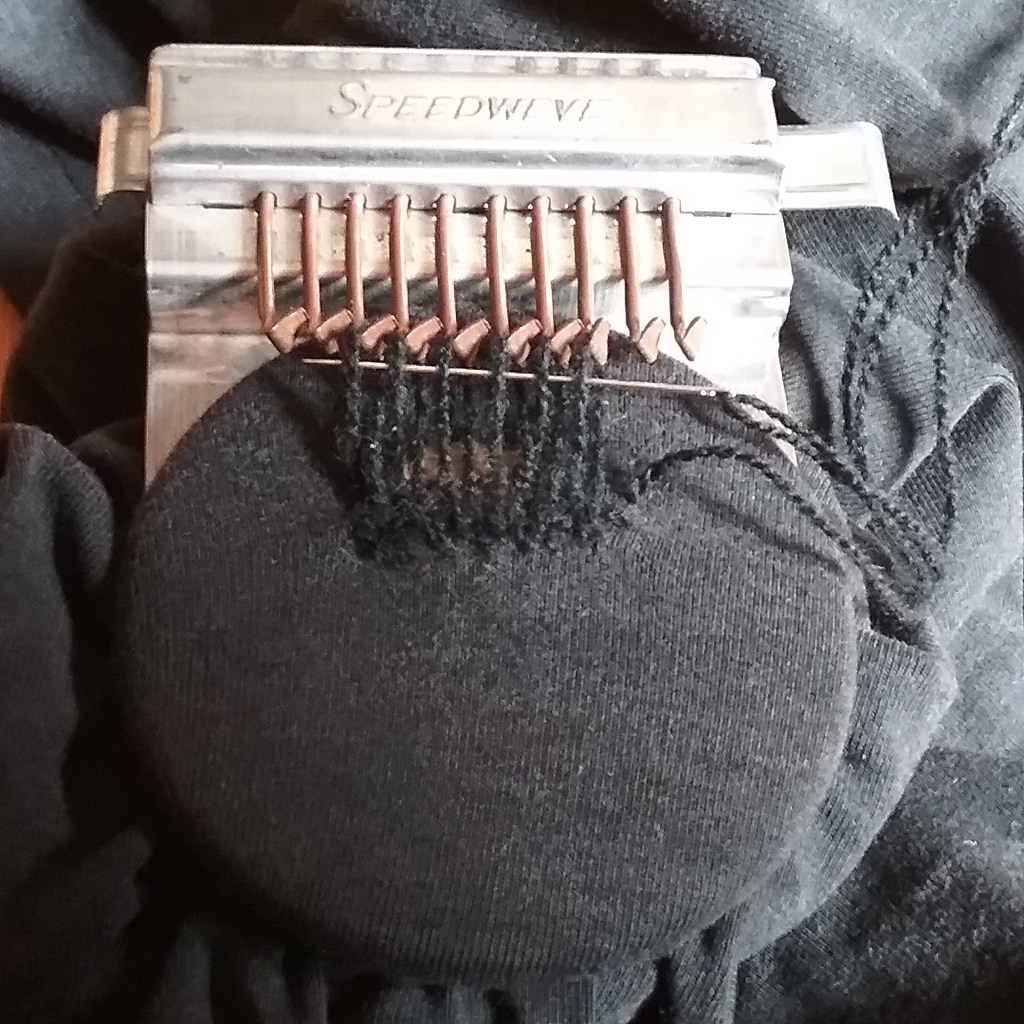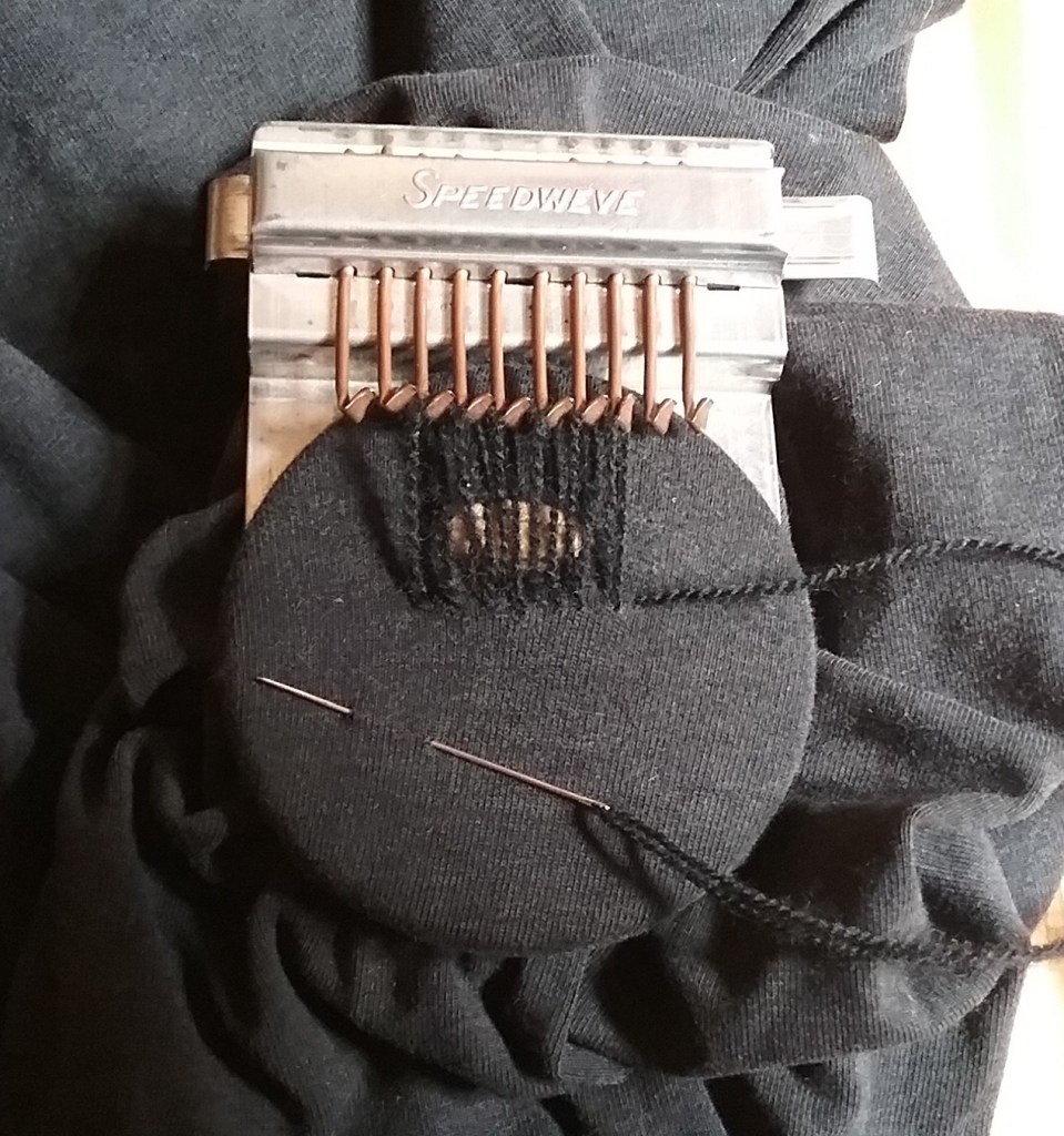 Much to my surprise the loom works rather well. As I was darning leggings, I expected the stretchy fabric to cause a problem, but the loom held it securely and kept the threads straight. When darning I would usually choose a thread of a similar size to that of the fabric, however since the hooks are a fixed size and space apart you need a minimum of a 2-ply yarn or the weave will be too open, but if the thread is too thick it will pop off the hooks (not so good if repairing thin weave linen or a thick jumper). I did find that on occasion my needle went through the middle of a warp thread rather than above or beneath it, which was difficult to see with the shadow of the hooks (though this may be because I was working with black).