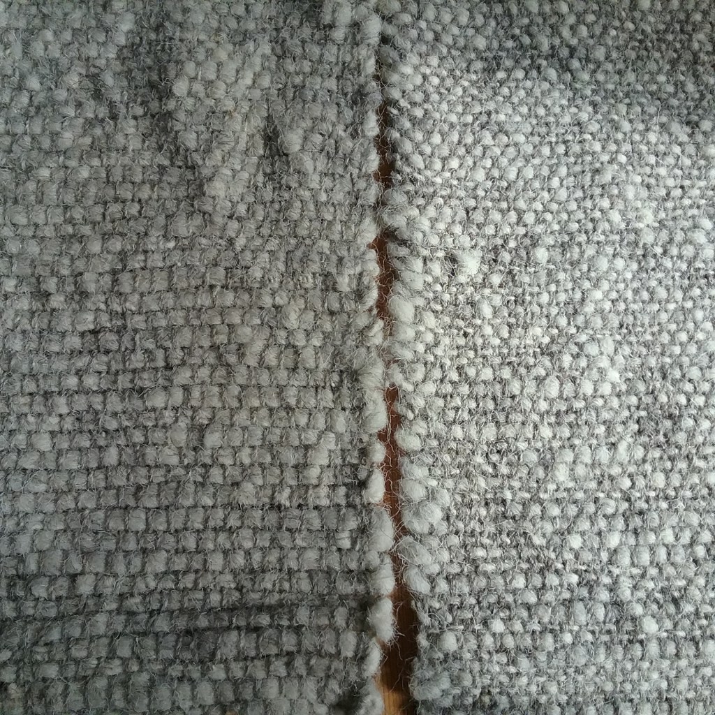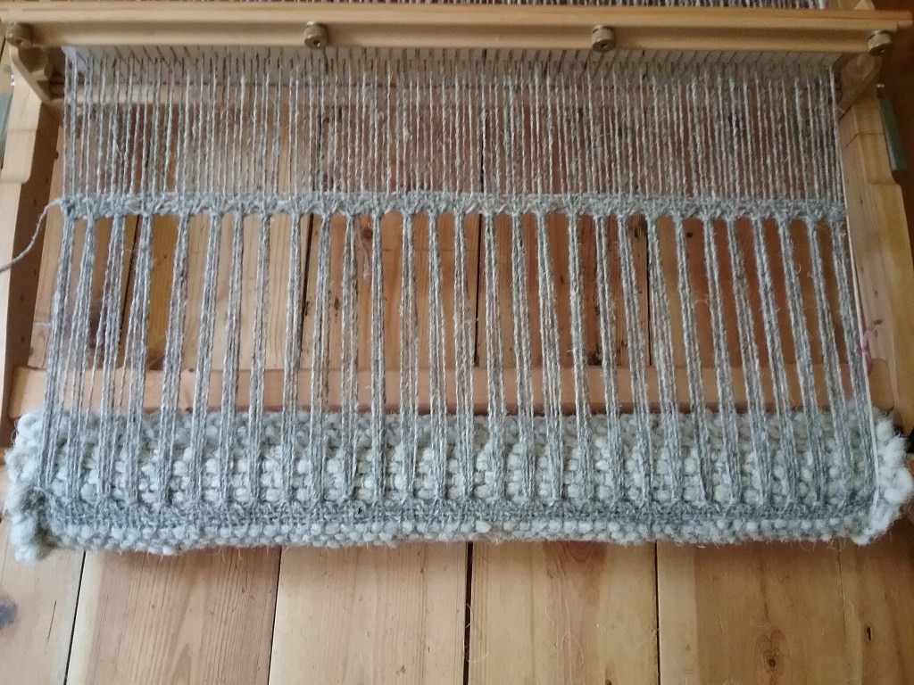 After making my sample square I warped up my Kromski Harp Forte with the commercial Herdwick yarn, initially starting with just enough length for one rug to see how it went. I found I had plenty of yarn, so ended up making several rugs and have some yarn left over to experiment with in the future. To make hemstitching easier, I wove a few rows at each end using the commercial yarn, which also secured the handspun a little better and should prevent it from coming loose. I began by plain weaving the Herdwick with a single strand of yarn, however after my first rug decided that I wanted to have a slightly thicker weft as some sections were much thinner than others, so I held the yarn double for subsequent rugs – you can see the slight difference below.