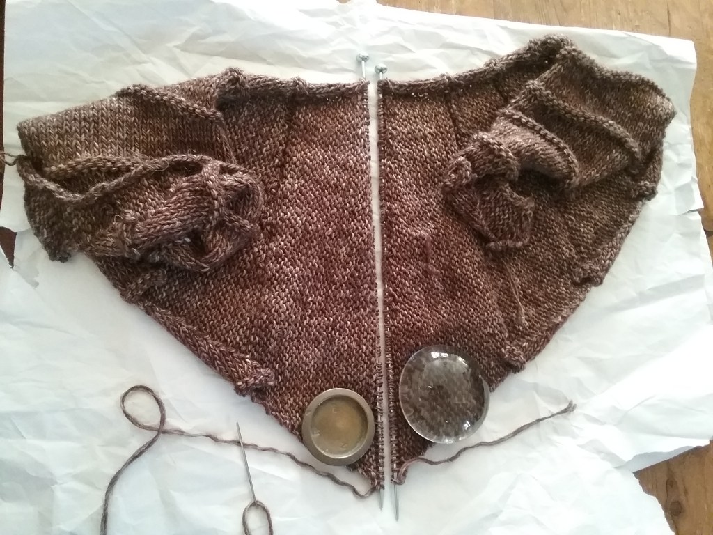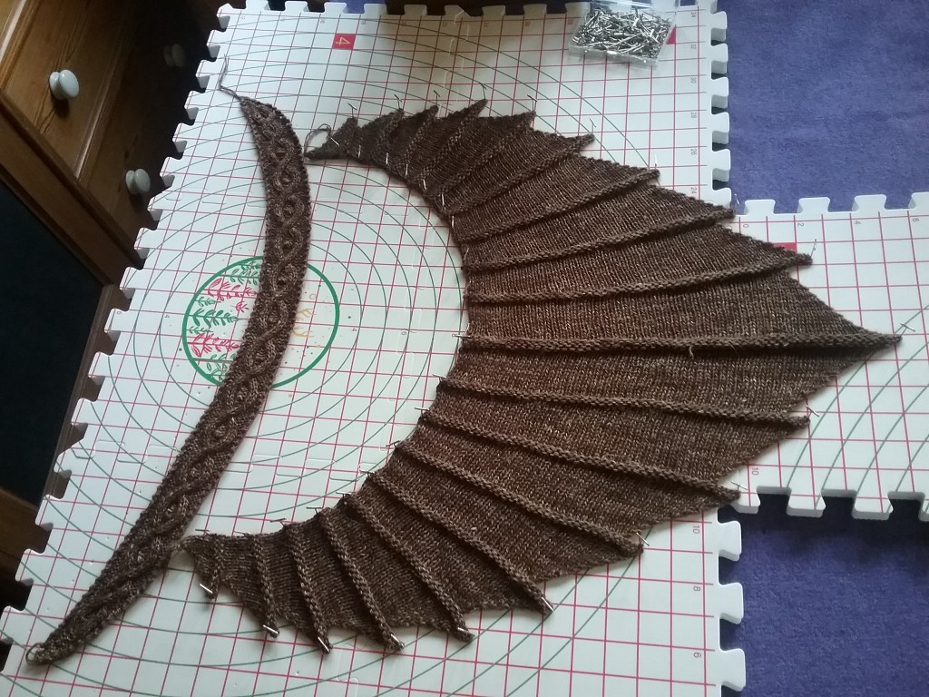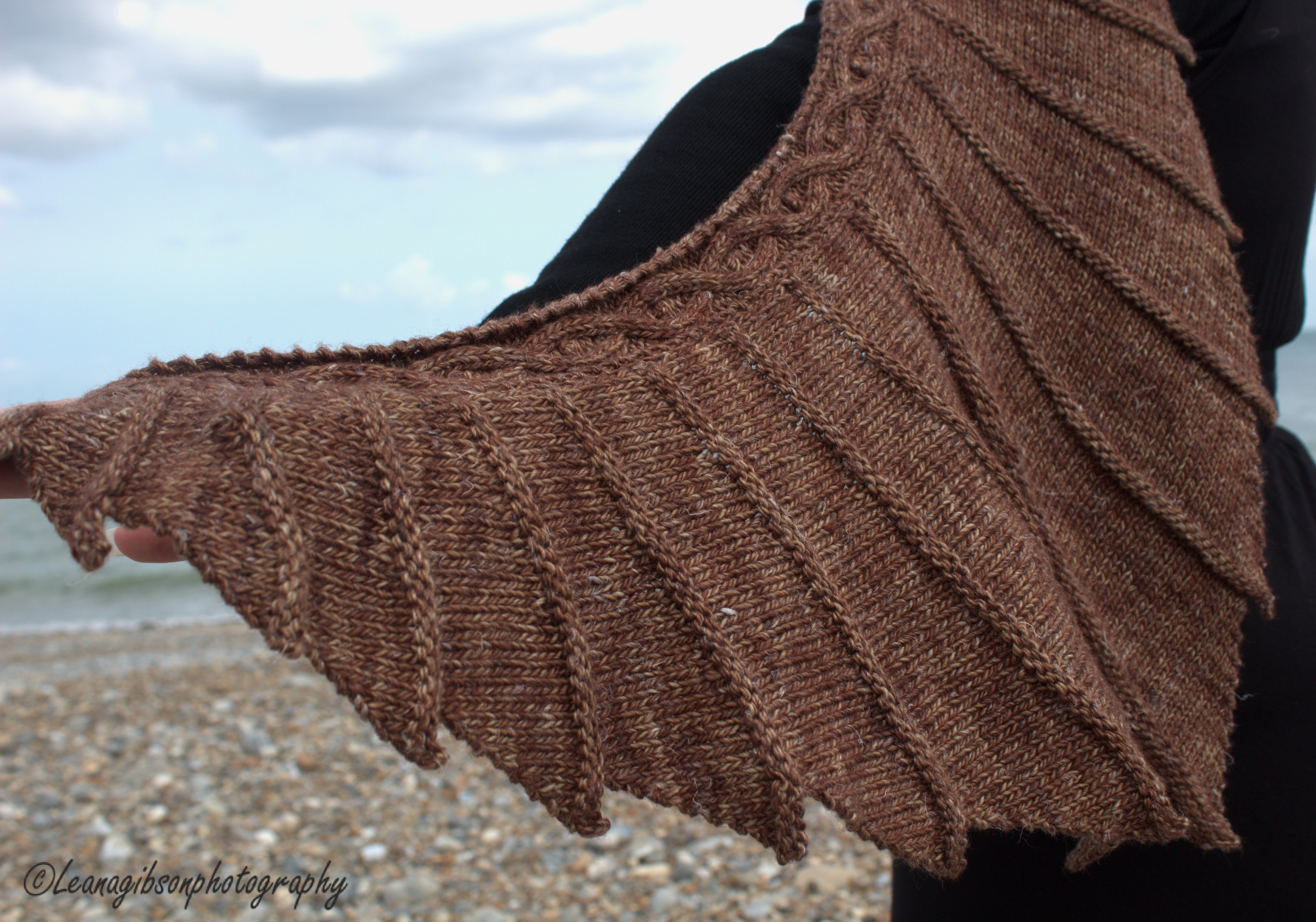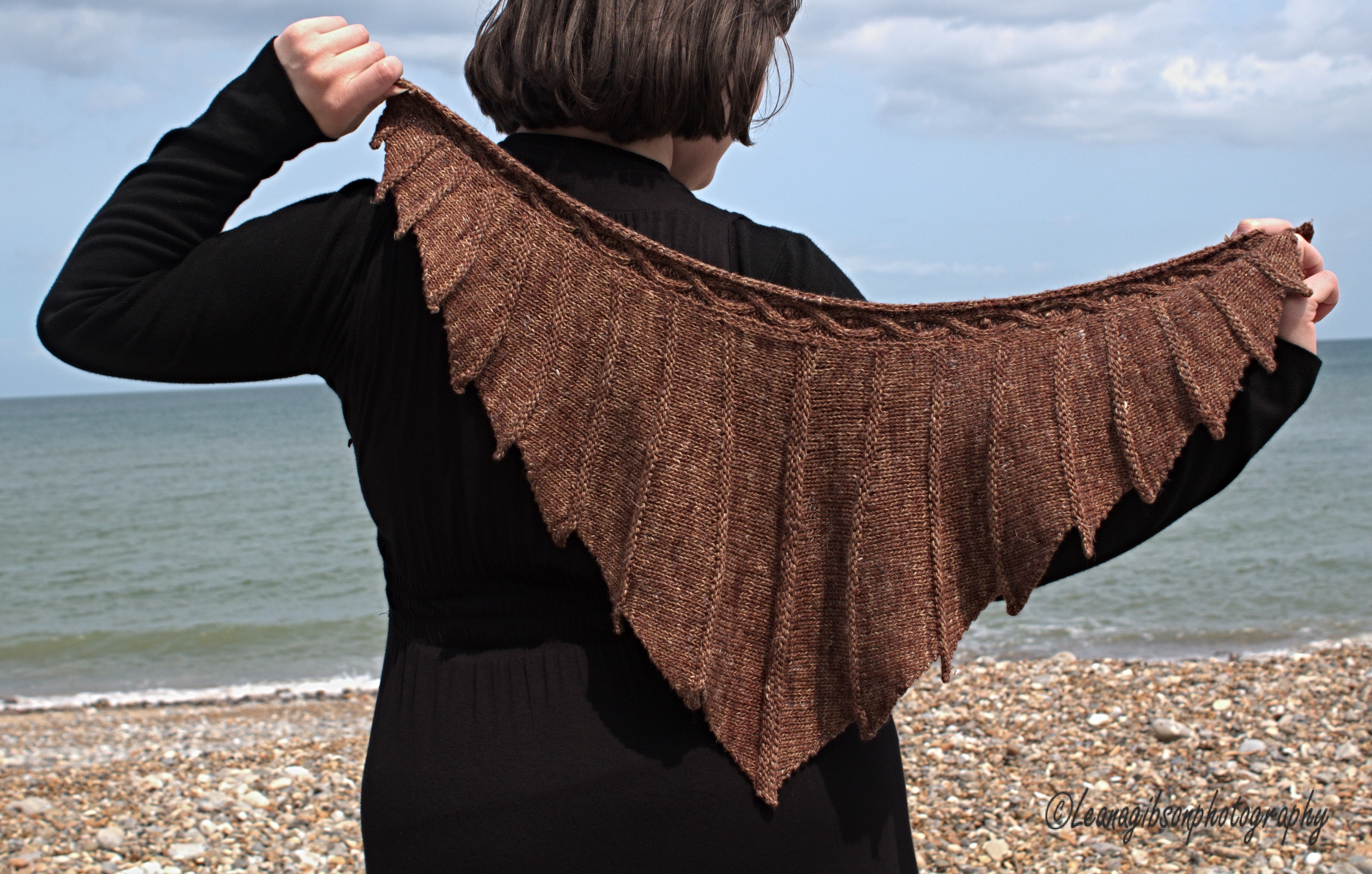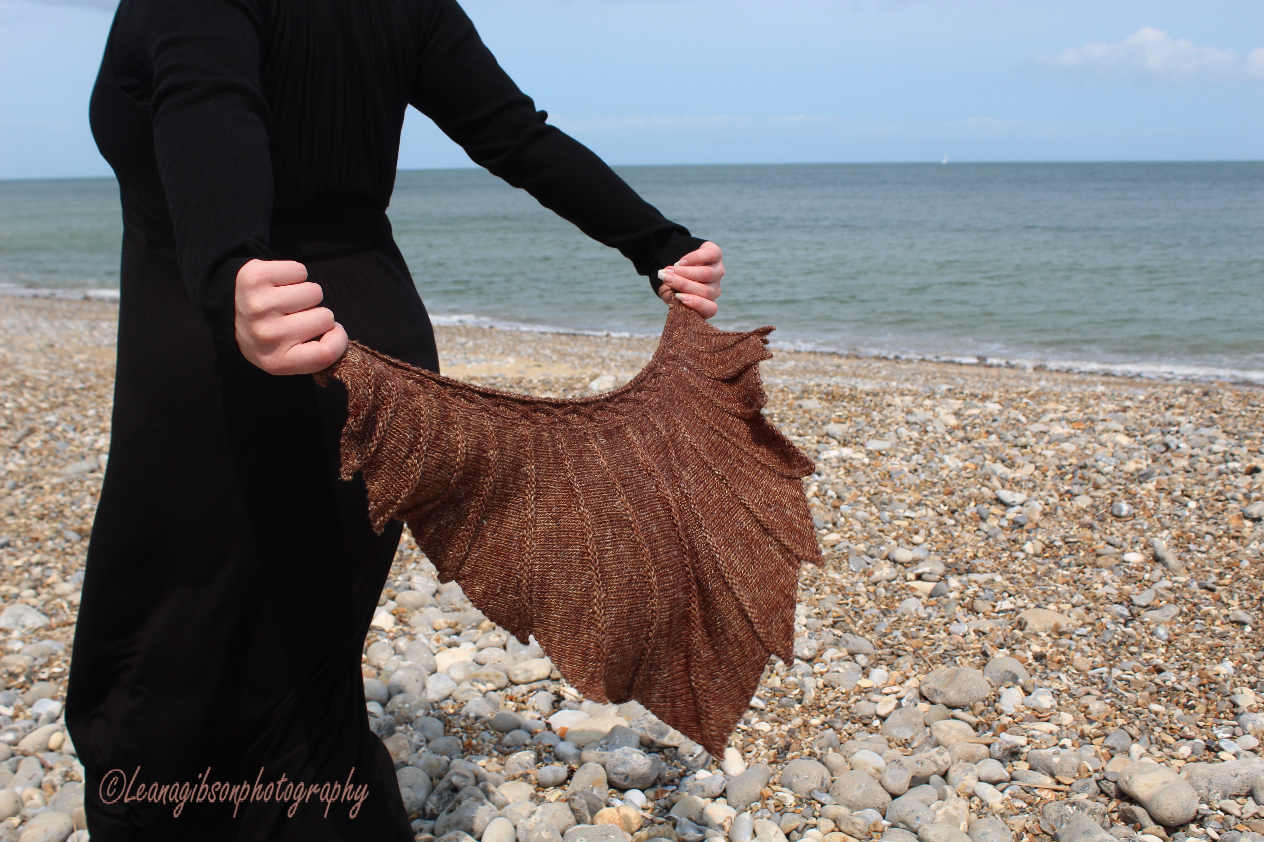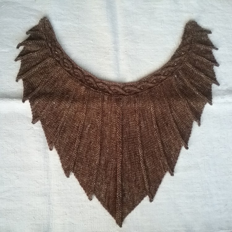 Like many crafters, some yarn in my stash has been hidden away patiently waiting for ‘just the right project’, but after trying to squeeze last years Tour de Fleece yarn into storage, I decided it was high time to use some of it. The yarn I used for this project was a ‘merlin singles 4ply’ in the colourway peat from a company called Knit me Sane who closed down several years ago, so the project had to take at maximum two skeins. The pattern is the small version of the Eagle Wrap from Alice Starmore’s Glamourie book which has some gorgeous designs that I’ll definitely be exploring with some of my handspun in the future.