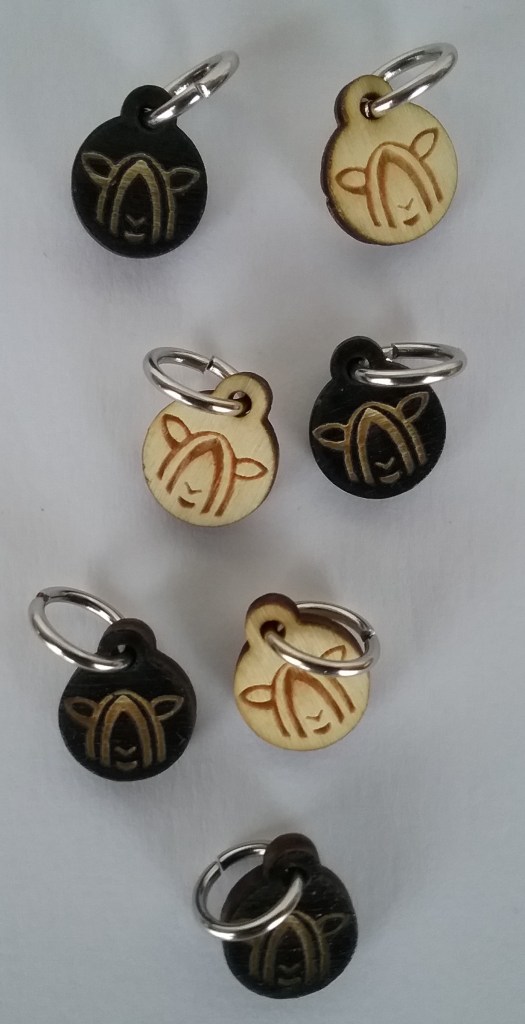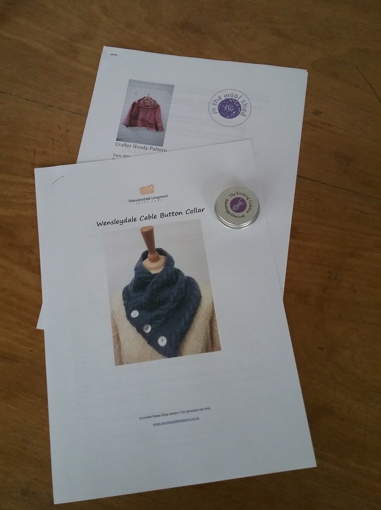 I purchased a couple of simple knitting patterns to try – ‘Crafter Hoody’ from In The Wool Shed and a cable collar pattern from the Wensleydale sheep shop (I’ve never attempted cable before and this looked like a good starter project). Whilst on their website I thought it was high time I got myself some proper stitch markers instead of using paperclips, so bought some little wooden ones with Wensleydale Sheep on.